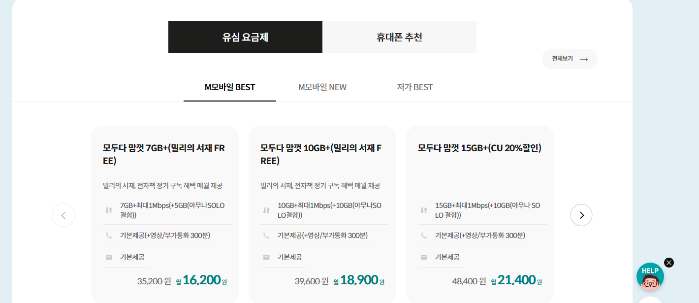 - 1GB 데이터에 음성 무제한 등 가성비 요금제가 많아 저가 요금제 찾는 사용자에게 인기